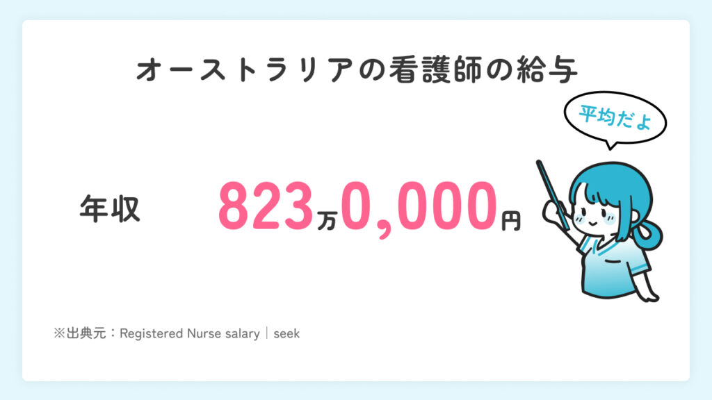 日本の正看護師と比べると、オーストラリアの正看護師の年収は300万円以上高いと考えられます。(2025年7月29日時点で1豪ドル=96.83円)