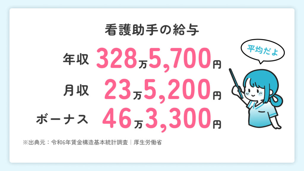 厚生労働省「令和6年賃金構造基本統計調査」によると、看護助手の方の年収は328万5,700円です。詳細は、次の表を参照してください。