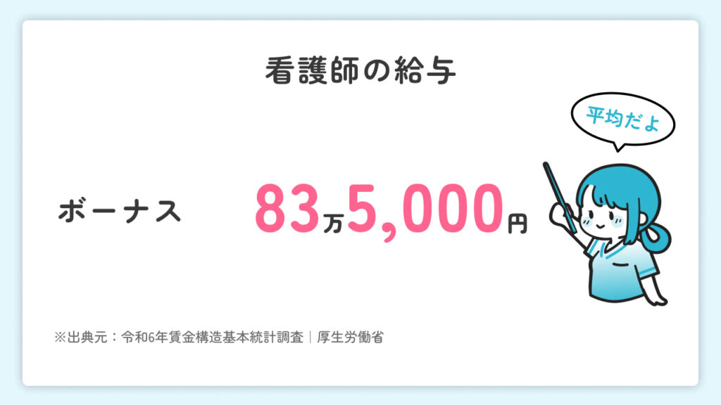 厚生労働省の「令和6年賃金構造基本統計調査」によると、看護師の方のボーナスは平均83万5,000円です。ここでは、看護師の方のボーナスについて次のポイントで紹介します。