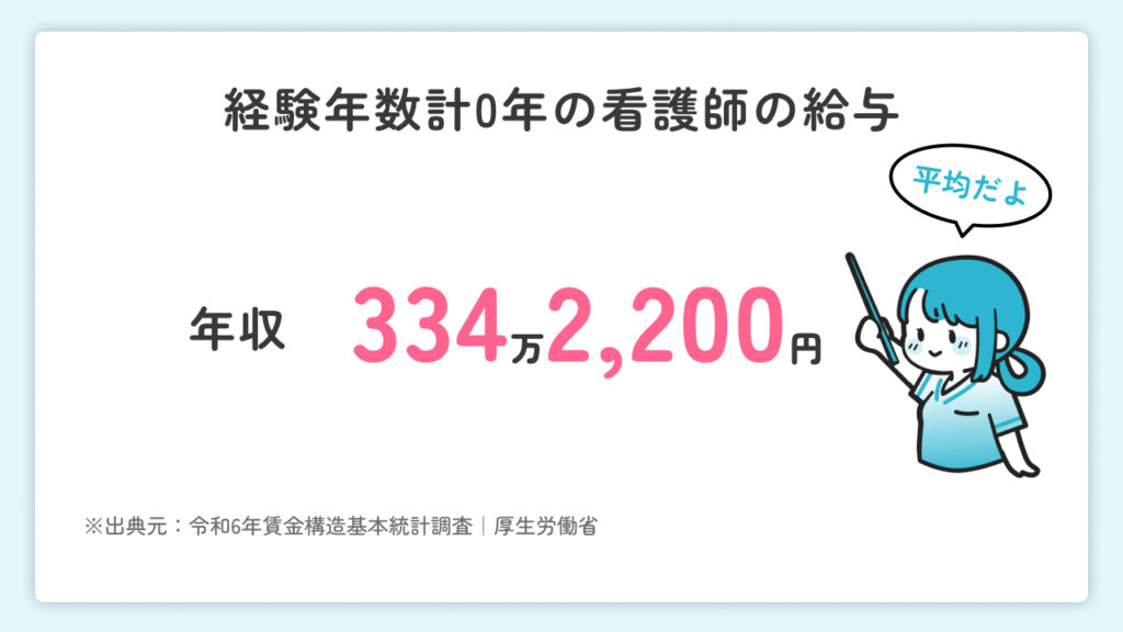 厚生労働省「令和6年賃金構造基本統計調査」によると、社会人から看護師になったときの年収は334万2,200円(経験年数計0年、所定内給与額と年間賞与をもとに計算)です。