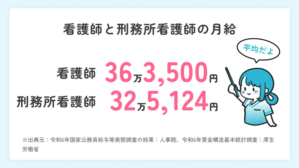人事院の調査によると、刑務所看護師の給料は平均32万5,124円です。一方で、厚生労働省の調査によると、看護師全体の平均月収は月額36万3,500円であるため、刑務所看護師の月収は平均よりやや低いといえるでしょう。