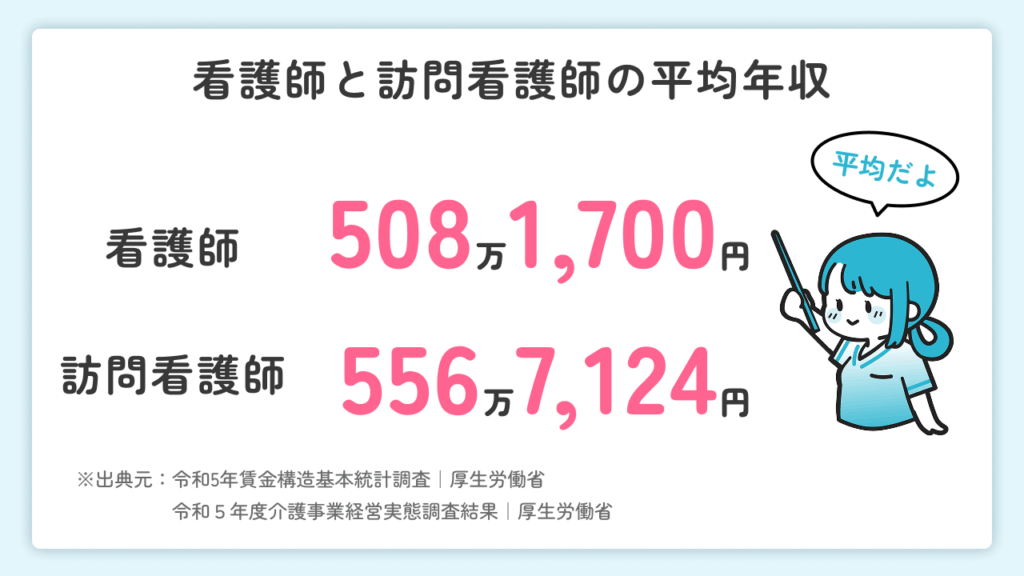 また、訪問看護師として働くと年収アップが期待できます。厚生労働省「令和5年賃金構造基本統計調査」によると、看護師の平均年収は508万1,700円です。一方で「令和5年度介護事業経営実態調査結果」によると、訪問看護師の平均年収は556万7,124円です。