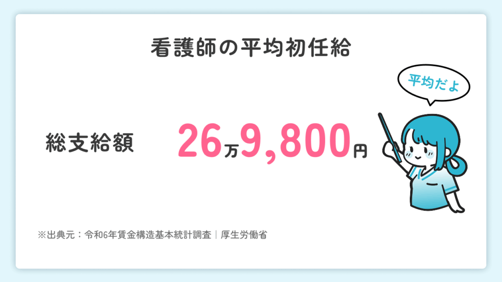 厚生労働省の「令和6年賃金構造基本統計調査」によると、看護師の初任給の平均は26万9,800円です。ただし、この額は総支給額のため、実際の手取りはそこから控除を引いた金額になります。