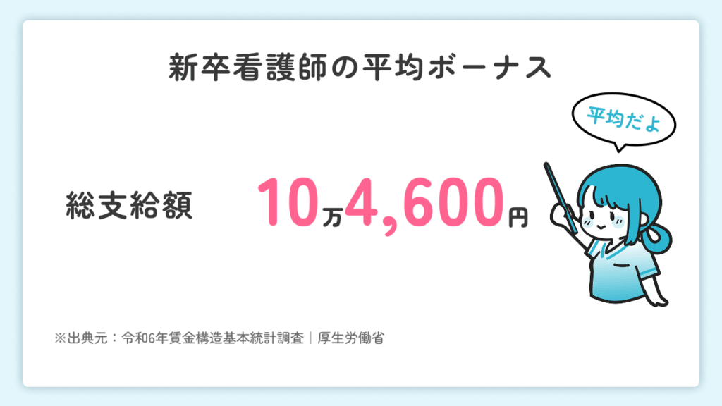 厚生労働省の「令和6年賃金構造基本統計調査」によると、新卒看護師のボーナスの平均は10万4,600円です。
