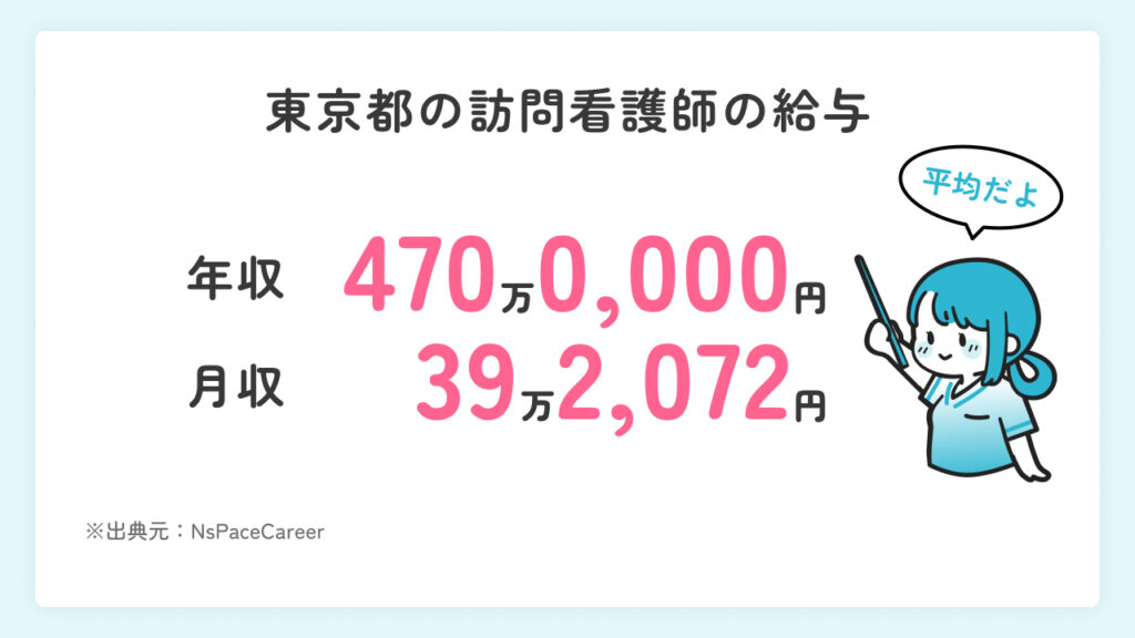 東京都で働く訪問看護師の月収から換算した年収は約470万円。賞与を含めると更に上回るケースもあると考えられます。(NsPaceCareerのデータから算出。2025年8月26日参照)これは、平均月収39万2,072円から算出した金額です。