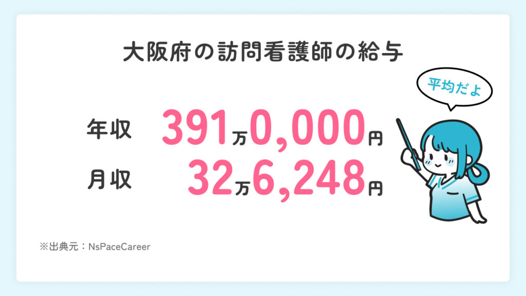 大阪府で働く訪問看護師の平均年収は、約391万円と考えられます。(NsPaceCareerのデータより。2025年8月28日参照)この平均年収は、大阪府の訪問看護師の月収32万6,248円をもとにしており、今回は賞与を含めていませんが実際には支給されるケースもあります。