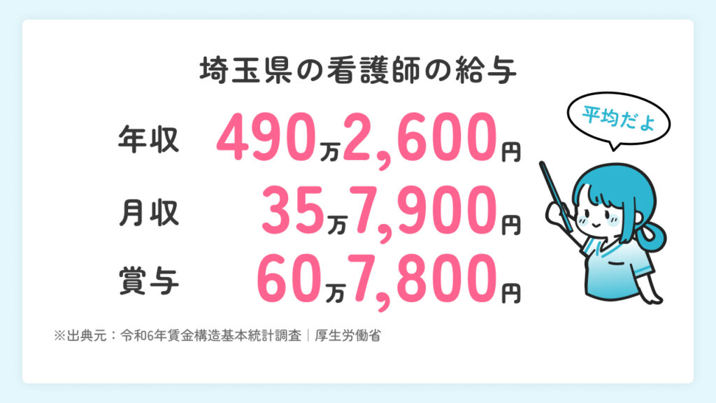 厚生労働省「令和6年賃金構造基本統計調査」によると、埼玉県で働く看護師の平均年収は490万2,600円です。ここでは、年収の内訳や手取りなどを知り、キャリアやライフプランを考えるときに役立てましょう。