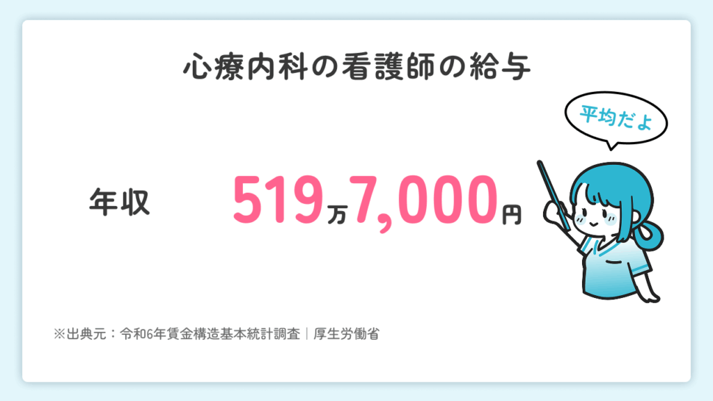 心療内科の病棟で働く看護師の年収は519万7,000円と、厚生労働省「令和6年賃金構造基本統計」による看護師の平均年収と変わりはないでしょう。