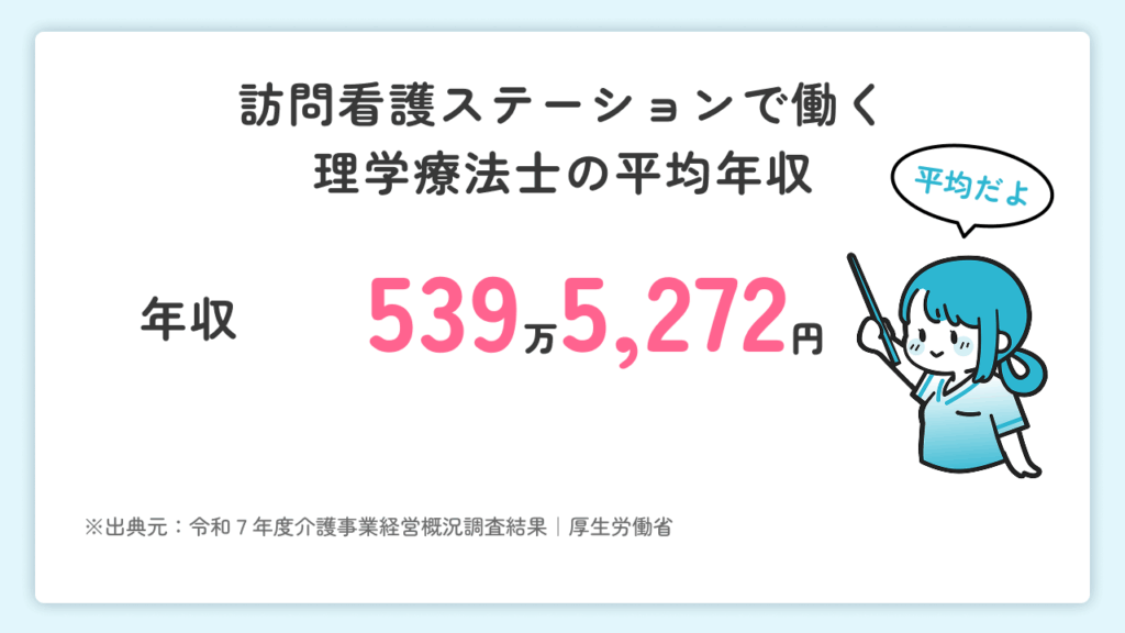 訪問看護ステーションで働く理学療法士の平均年収は、厚生労働省「令和7年度介護事業経営概況調査」によると539万5,272円です。一方、理学療法士を含むリハビリテーション職の平均年収は、厚生労働省「令和6年賃金構造基本統計調査」によると444万1,500円とされており、訪問看護分野では比較的高い水準です。