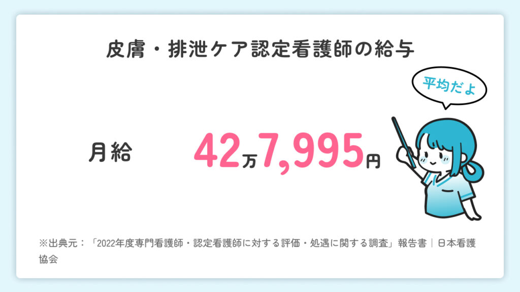 日本看護協会の調査によると、皮膚・排泄ケア認定看護師の平均給与は42万7,995円です。