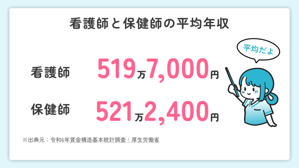 ただし、令和5年の調査では看護師の平均年収は508万1,700円、保健師は451万500円であり、看護師が約57万円上回っていました。令和6年の調査で逆転した背景には、コロナ禍を経た行政保健師の処遇改善や、看護師の働き方改革による夜勤・残業の減少が影響していると考えられます。