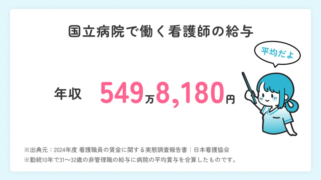国立病院で働く看護師の平均年収は、549万8,180円が目安です。(勤続10年で31~32歳の非管理職の給与に病院の平均賞与を合算したものです)これは、日本看護協会の「2024年看護職員の賃金に関する実態調査」をもとにした数値です。
