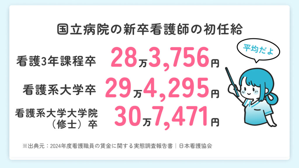 国立病院における、看護系大学卒(4年制)の新卒看護師の初任給は29万4,295円です。
